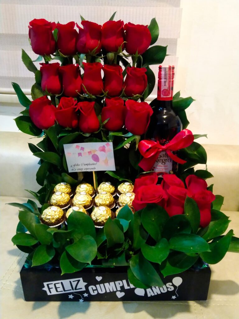 Caja vino chocolates y 6 rosas R84